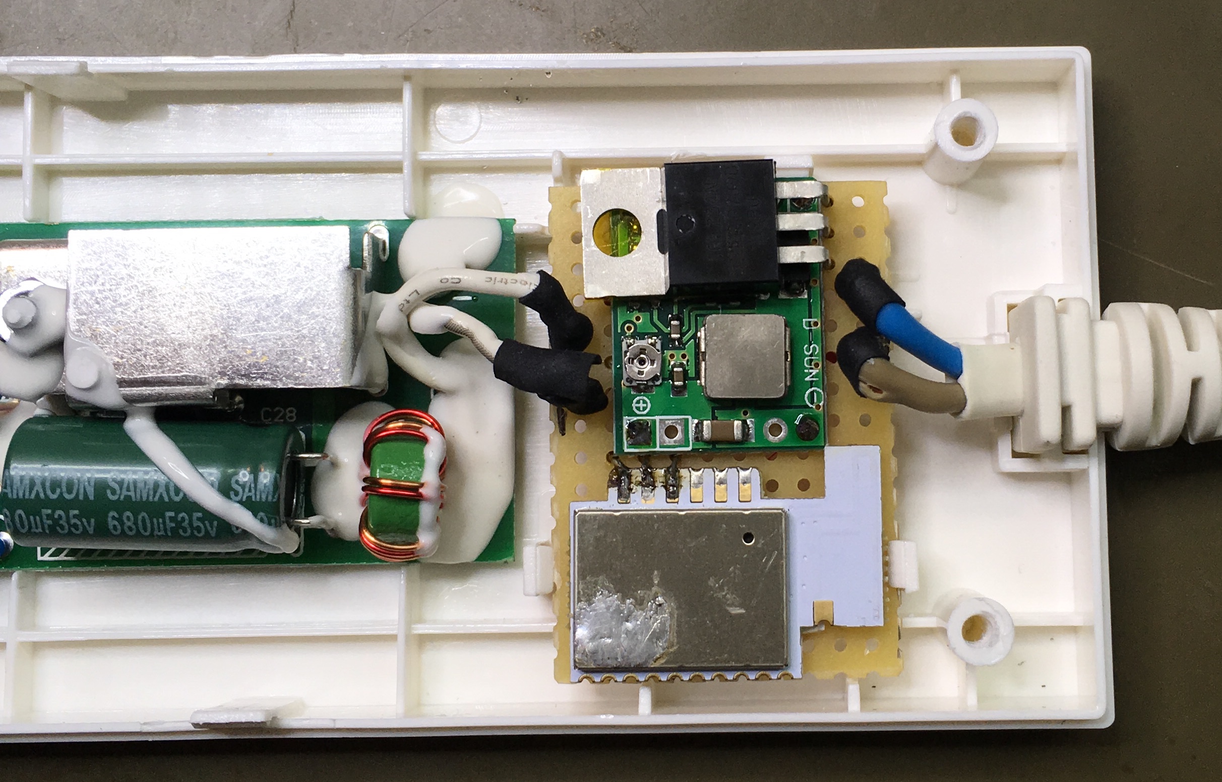 An den hinteren Anschlusskabeln schließt man entweder direkt Lüsterklemmen an oder wie im Bild zu sehen, verlängert eine Lötverbindung die Anschlußreichweite. Für die andere Seite habe ich zusätzlich eine Schutzkappe gelasert, sodaß nur die LED Anschlüsse sowie die Zigbee Antenne nach draußen ragen SVG file.