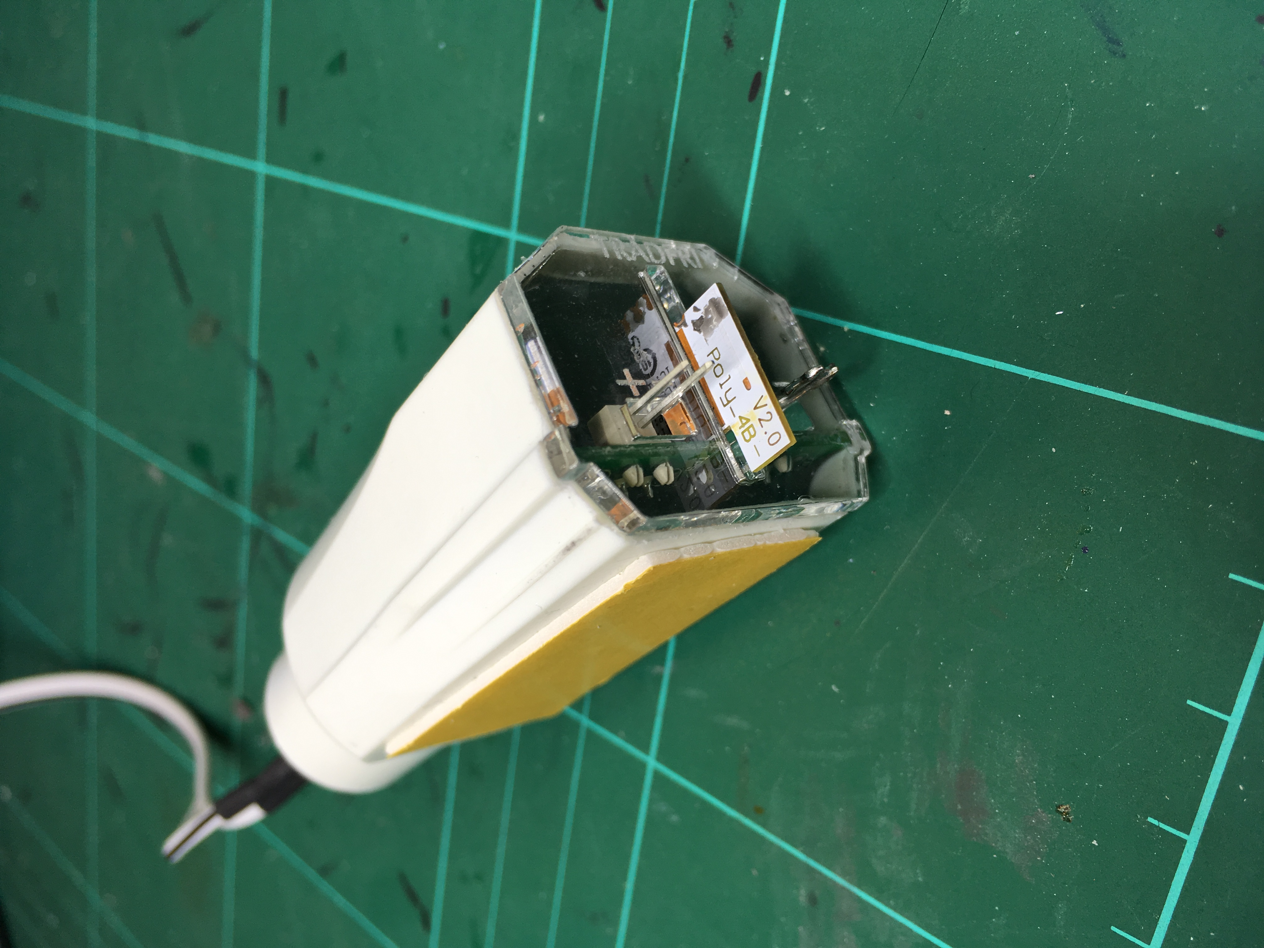 Die rechte Leuchte passt ziemlich gut in den Regelbereich des Original Trådfri Modul mit Weißspektum. Daher läßt sich das Modul aus der E27 980lm Lampe komplett verwenden. Aber Vorsicht wir handhaben hier ja Netzspannung. Eingebaut wirkt die Steuerung sehr kompakt.