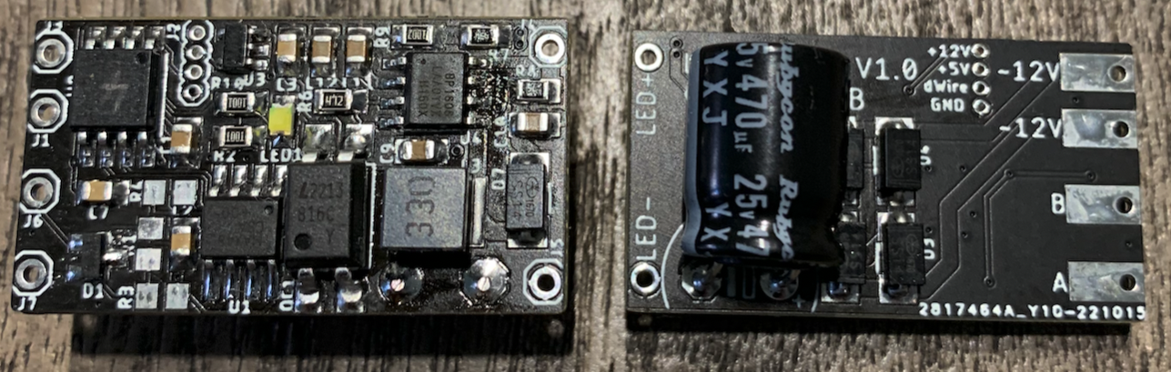 Der LED Boost Driver mit dem BP1808 muss um eine Schaltung für den Empfang von seriellen Daten über RS485 erweitert werden und das ganze möglichst klein. Der Innenraum des Lampengehäuses fasst nur ca. 40mm x 20mm. Als Steuer-CPU fiel die Wahl auf einen ATTINY85 von MicroChip den es im kleinen 8-pin SOIC Gehäuse gibt. Zudem verfügt er über ein EEPROM (z.B. für die Lampen ID), Oszillator on Chip und eine debugWIRE Schnittstelle. Die erlaubt in-place Debugging und vereinfacht so die Softwareentwicklung. Den RX485 Driver gibt es z.B. von MAXIM auch im SOIC8 Gehäuse.