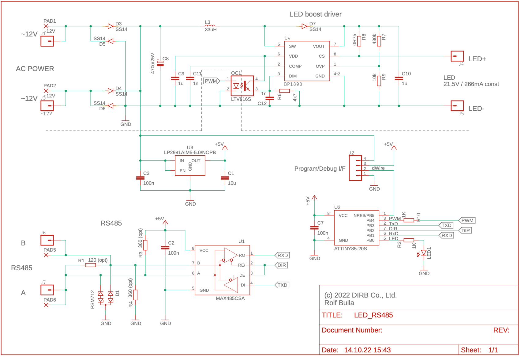 Der LED Boot Driver ist identisch zur Originalversion und nur durch die PWM-Ansteuerung ergänzt. Da ich bei den ersten Versuchen ein paar Hardwareausfälle (ATTINY85 + BP1808) wegen Überspannung hatte, wird das PWM Signal galvanisch mit einem Optokoppler (OC1) getrennt. An der RS485 Schnittstelle sind auch optional die Abschlusswiderstände vorgesehen (R1,R3,R4). Der MAXIM Baustein arbeitet im Halb-Duplex, daher steuern wir die Richtung (Empfangen oder Senden) zusätzlich über den ATTINY85. Der letzte freie Ausgang an der CPU steuert eine Status-LED (LED1). Die hilft beim Debuggen und der Inbetriebnahme, vor allem wenn man die POWER-LED abgeklemmt lässt.