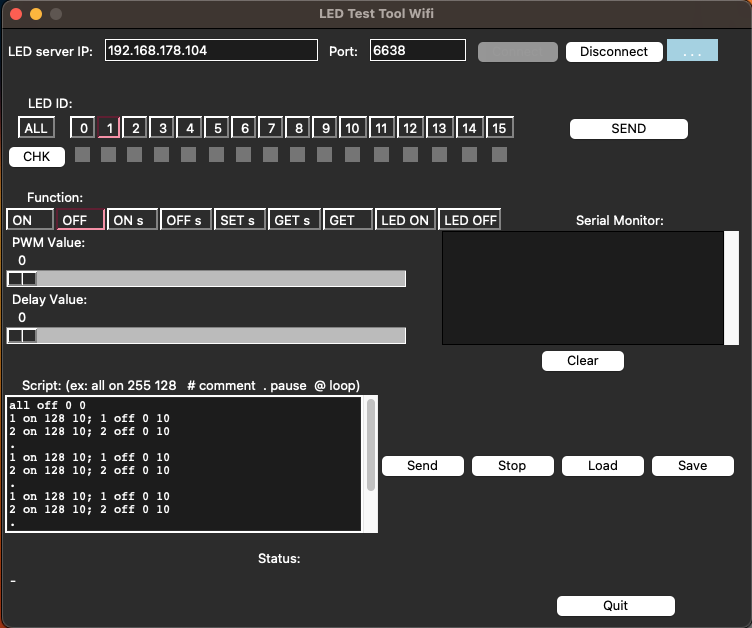 Damit lassen sich alle Funktionen auf alle oder einzelne LEDs ausführen. Mit CHK wird nach angeschlossen LEDs gesucht und im unteren Bereich steht ein einfacher Skript Editor zur Verfügung der die Programmierung von Abläufen erlaubt, bei einer Stepzeit von 100ms also 10Hz. Ein Gimmick für Silvester oder andere Parties.