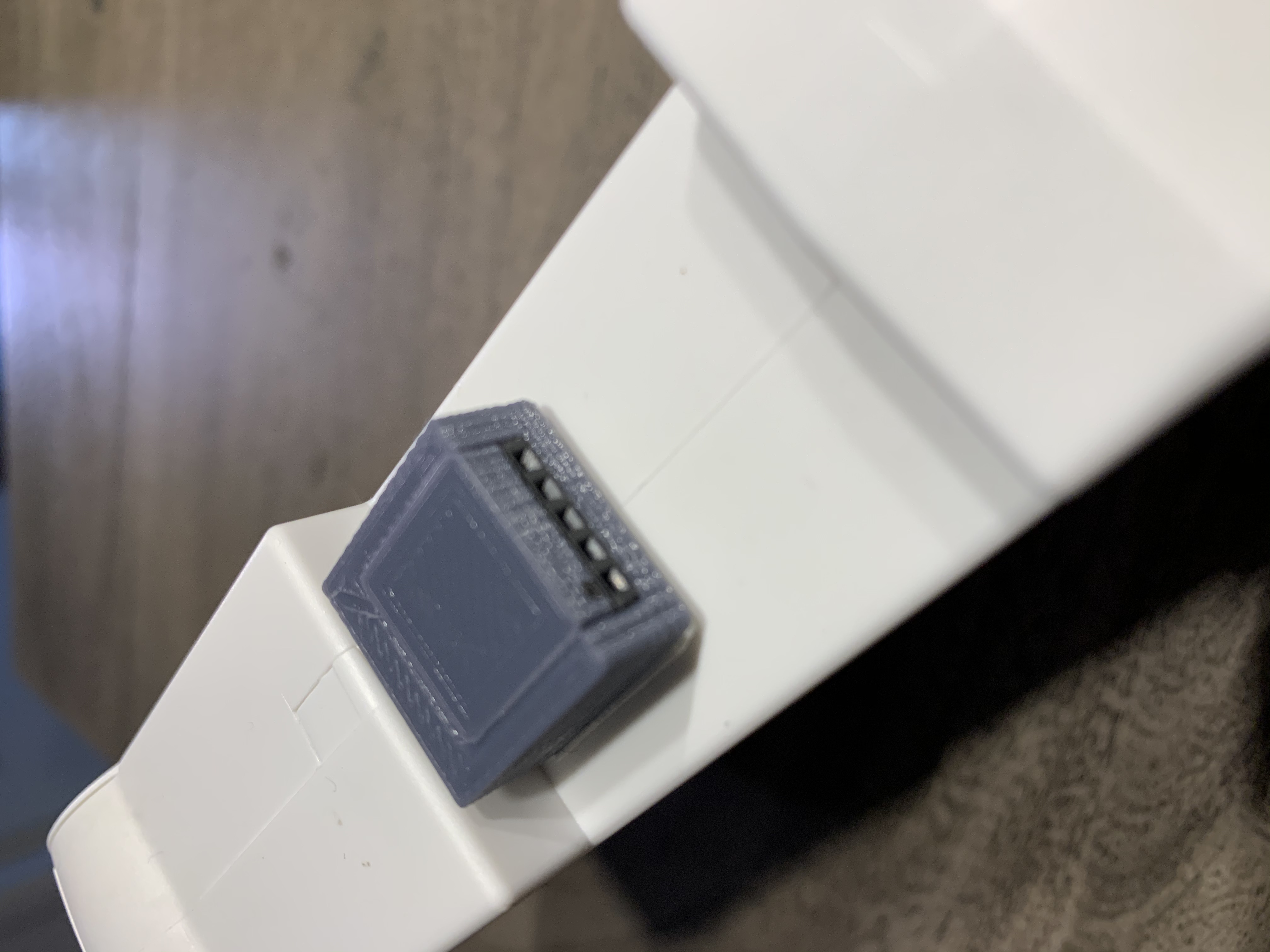 Es lässt sich wie abgebildet im 3D Drucker ohne Stützstrukturen drucken. Der kleine Block rechts dient zum Schutz der POGO Pins und lässt sich auf diese aufschieben.
