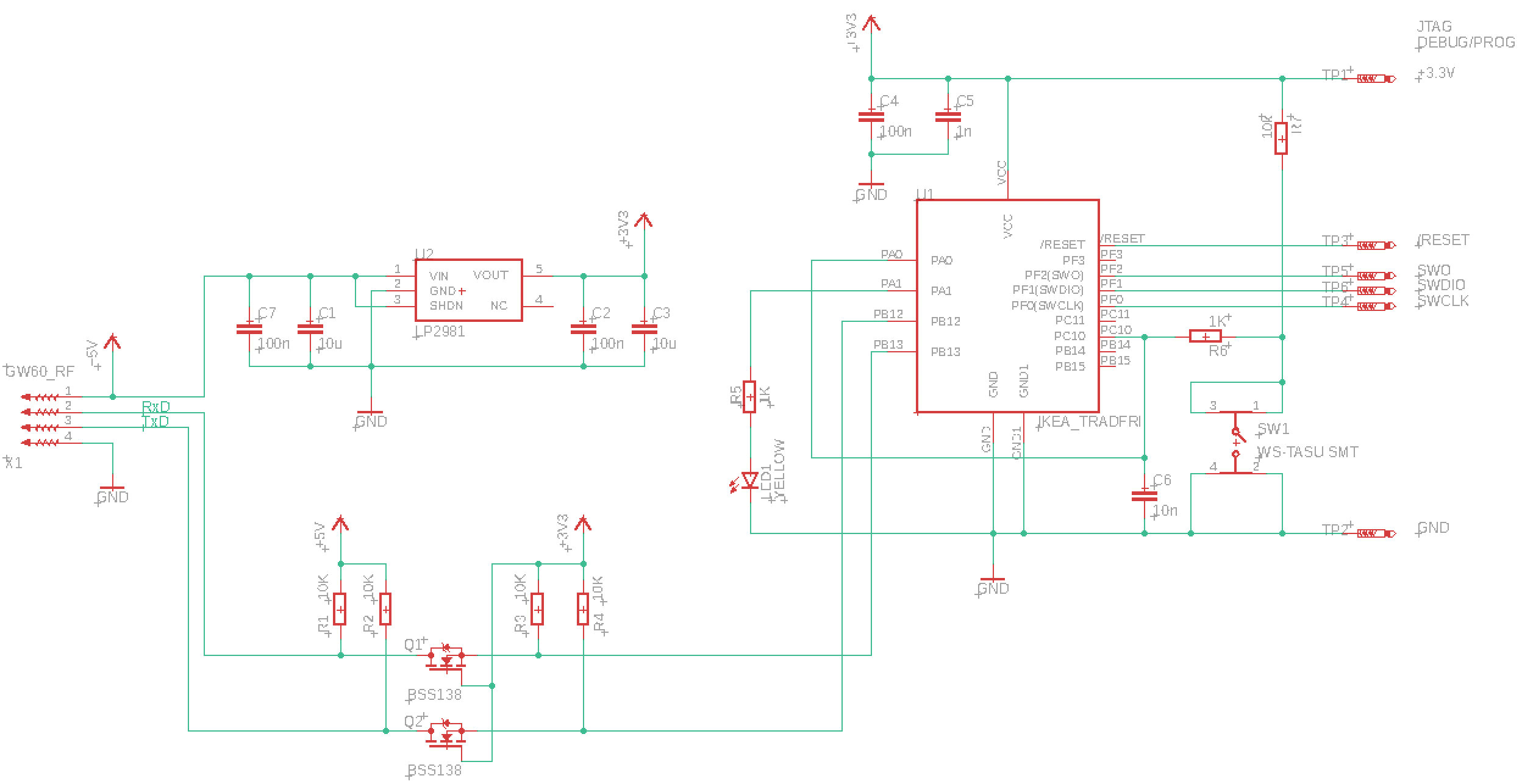 Die erste Aufgabe ist die Anbindung des TRÅDFRI Moduls an den GW60 sodass es mechanisch wie elektrisch wie der Originalempfänger ZB40 ausschaut. Das TRÅDFRI Modul arbeitet mit 3.3V während der GW60 Controller mit 5V versorgt wird. Der Schaltplan muss daher zwei Level-shifter und einen Spannungsregler enthalten. Meine Lösung sieht wie folgt aus:
