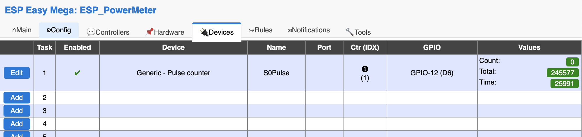 Als nächstes brauchen wir ein Device was den Zeit zwischen den Pulsen misst und speichert. Das lässt sich über den Reiter Devices erreichen. Für jeden S0 Input braucht es ein eigenes Device. Hier ist wie in meiner Lösung nur eins gezeigt.