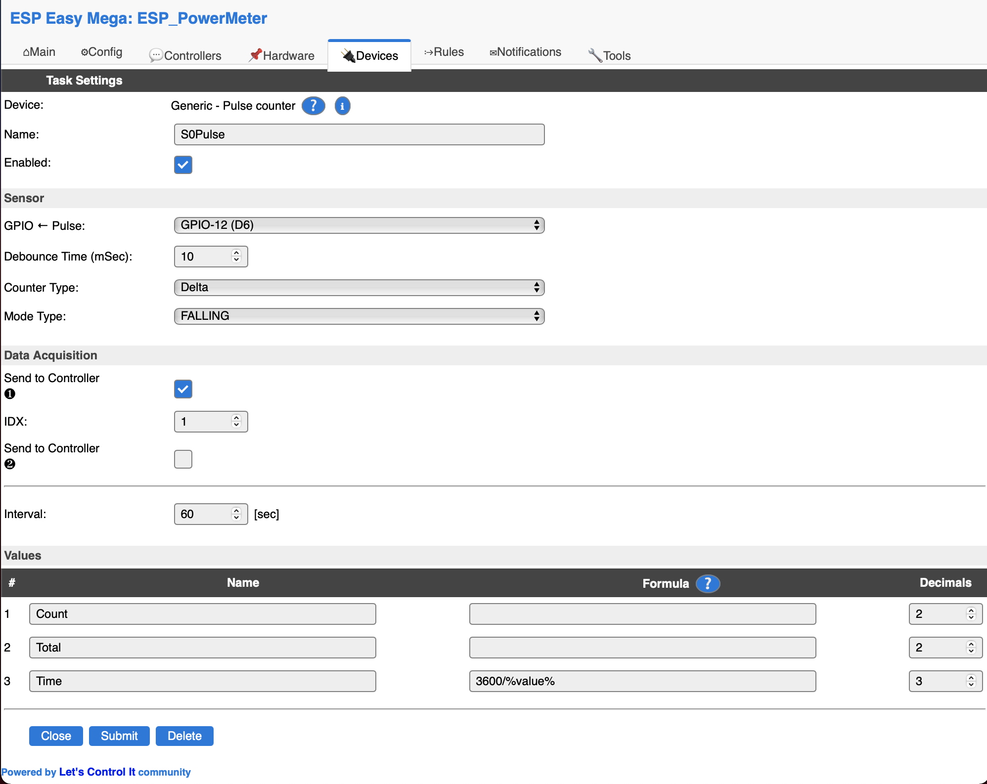 Die grünen Zahlen rechts geben übrigens die aktuellen Messwerte wieder. In dem Beispiel liegt die Zeit bei 25991ms was einem Verbrauch von 138.5 Watt entspricht. Hier die Einstellungen für den Pulse Counter: