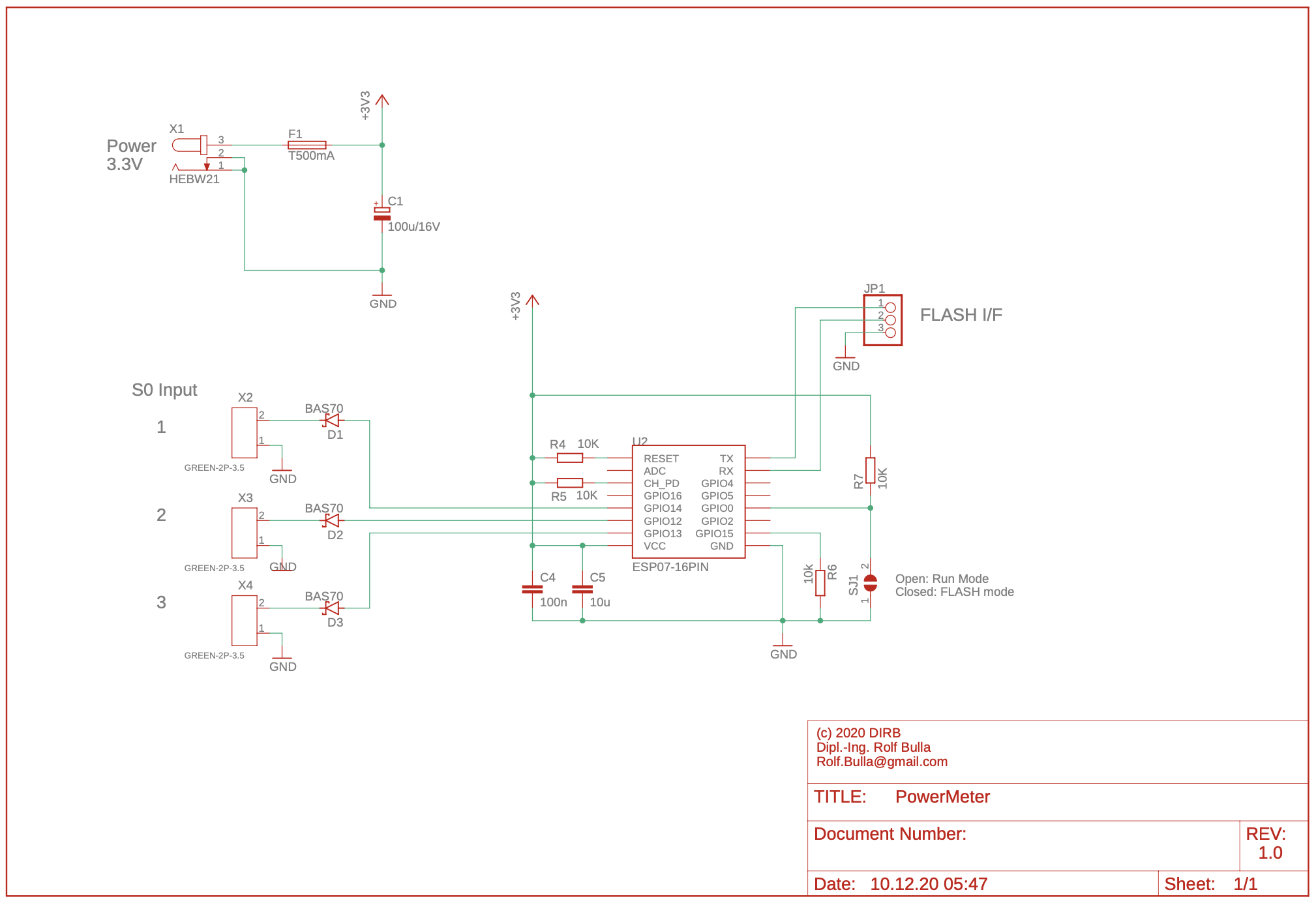 Die internen Pullups versorgen den Optokoppler im Drehstromzähler und so lässt sich der Impuls an den jeweiligen Pins erkennen. Die Dioden D1-D3 dienen nur dem Verpolungsschutz und sind nicht unbedingt nötig. Natürlich kann man die S0 Leitungen auch direkt an das Modul anschliessen und umgeht so die Platine mit einer Freiverdrahtung. Für meine Lösung habe ich allerdings ein PCB erstellt.