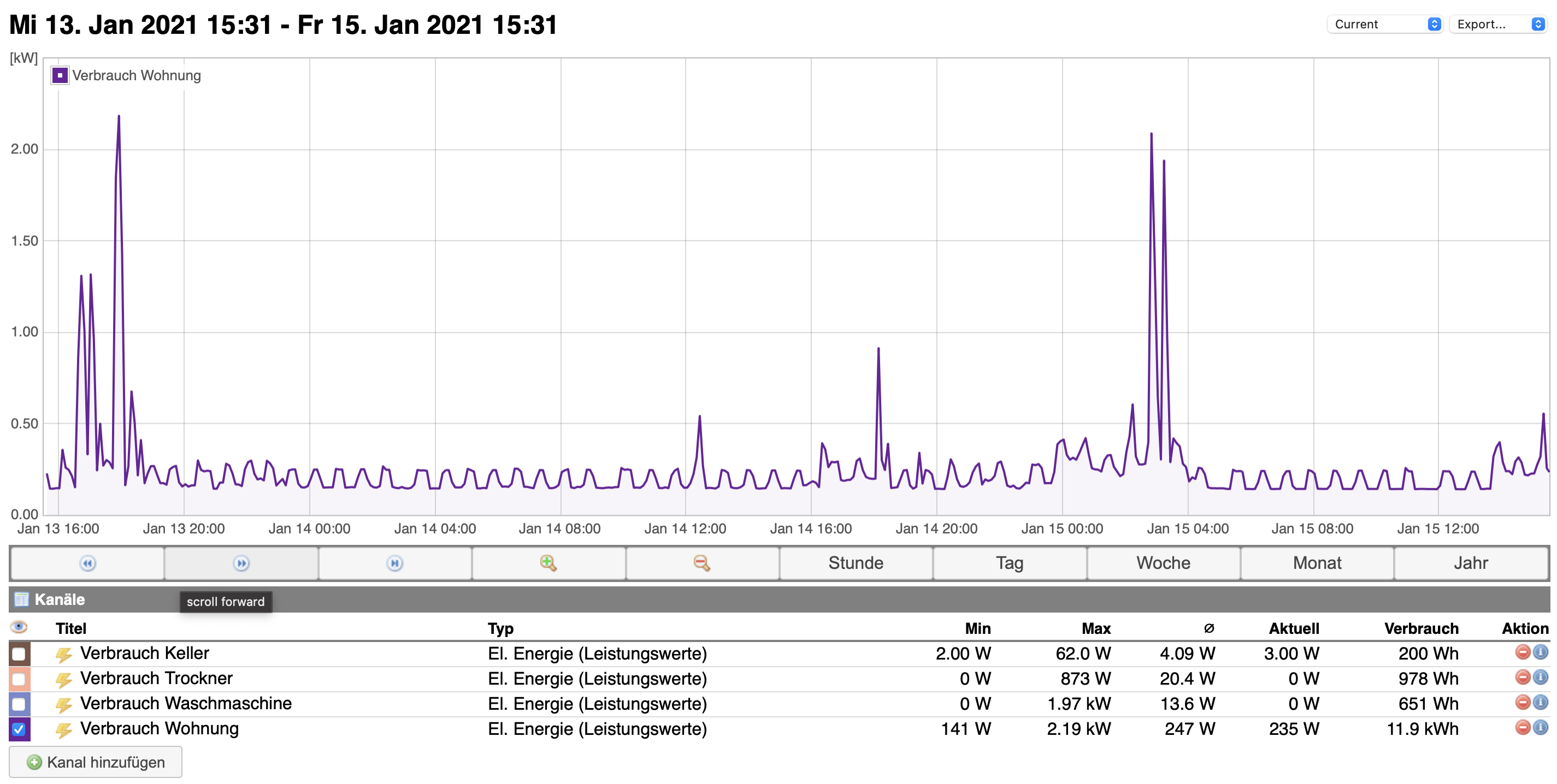 Das PowerMeter läuft jetzt bei mir seit mehr als einem Jahr ohne Probleme und übermittelt die Daten. Ein typischer Verbrauchsverlauf sieht so aus (Screen shot aus meinem //Volkszähler//):