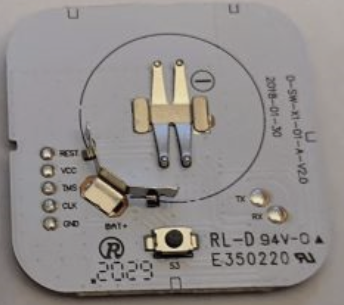 Wie man den Taster öffnet ist hier gut beschrieben. Die Anschlüsse zum Programmieren sind auf der Rückseite des PCBs beschriftet und die Verbindung zum Debugger ergibt sich daher wie folgt: