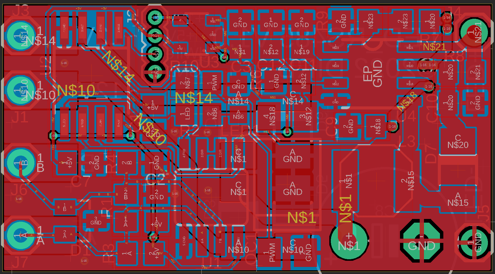 Der LED Boot Driver ist identisch zur Originalversion und nur durch die PWM-Ansteuerung ergänzt. Da ich bei den ersten Versuchen ein paar Hardwareausfälle (ATTINY85 + BP1808) wegen Überspannung hatte, wird das PWM Signal galvanisch mit einem Optokoppler (OC1) getrennt. An der RS485 Schnittstelle sind auch optional die Abschlusswiderstände vorgesehen (R1,R3,R4). Der MAXIM Baustein arbeitet im Halb-Duplex, daher steuern wir die Richtung (Empfangen oder Senden) zusätzlich über den ATTINY85. Der letzte freie Ausgang an der CPU steuert eine Status-LED (LED1). Die hilft beim Debuggen und der Inbetriebnahme, vor allem wenn man die POWER-LED abgeklemmt lässt.