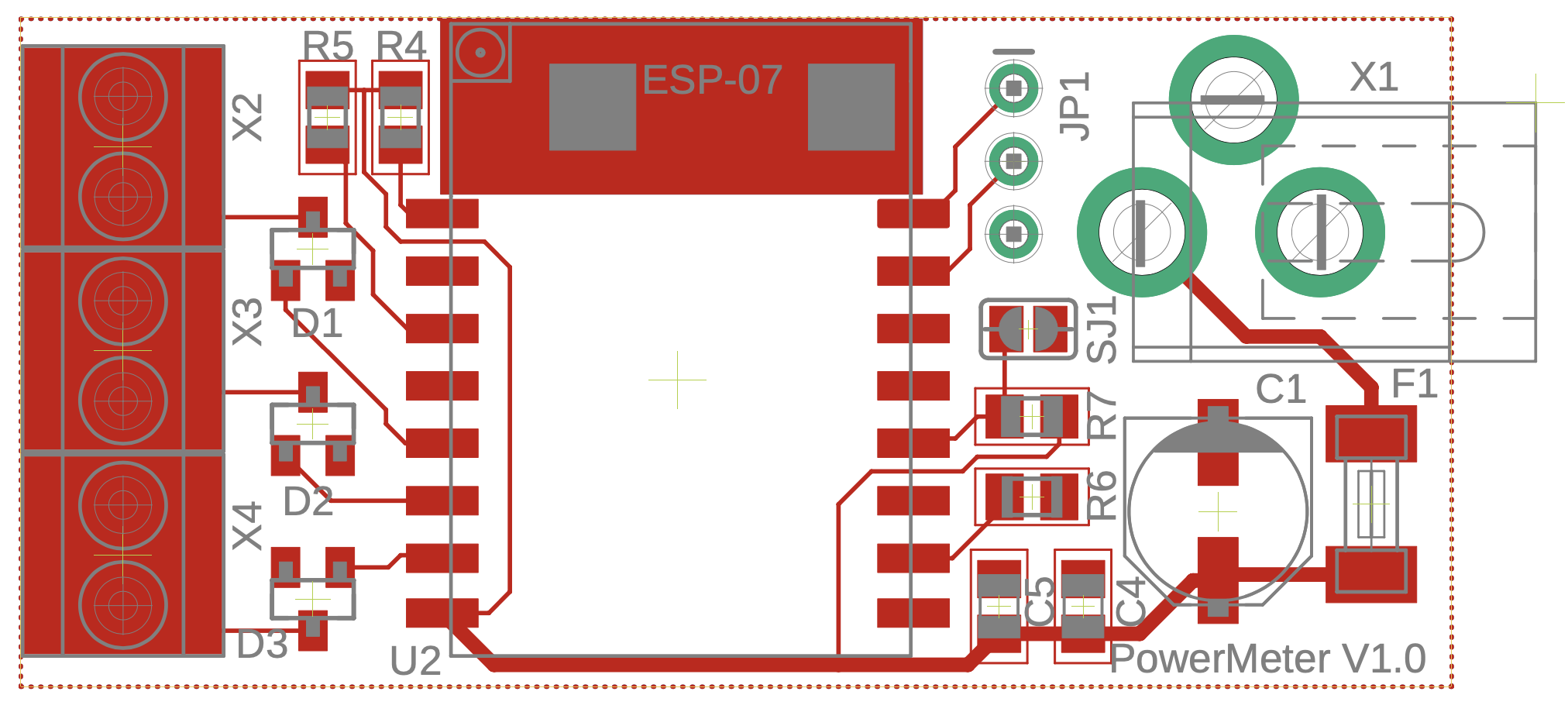 Die internen Pullups versorgen den Optokoppler im Drehstromzähler und so lässt sich der Impuls an den jeweiligen Pins erkennen. Die Dioden D1-D3 dienen nur dem Verpolungsschutz und sind nicht unbedingt nötig. Natürlich kann man die S0 Leitungen auch direkt an das Modul anschliessen und umgeht so die Platine mit einer Freiverdrahtung. Für meine Lösung habe ich allerdings ein PCB erstellt.
