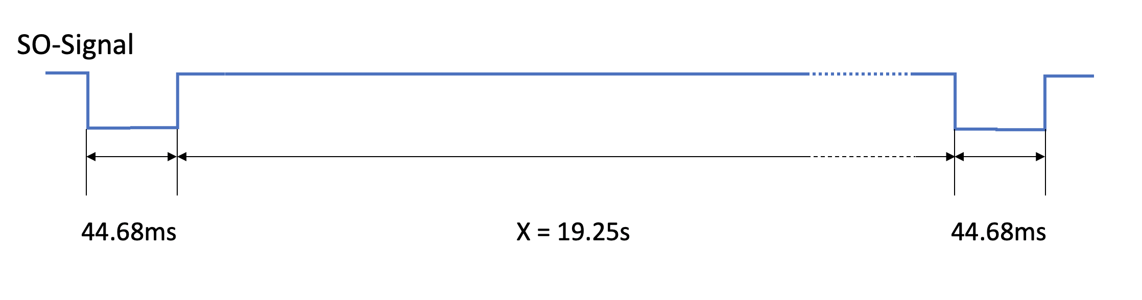 Es kommen also Impulse von ca. 44ms und der Abstand zwischen den Impulsen gibt den aktuellen Verbrauch wieder. In dem Beispiel sind es 19.25 Sekunden. Gemäss der Gerätespezifikation können wir 1000imp/KWh erwarten. Dies ist auch auf dem Zähler vorne vermerkt. Daraus ergibt sich die Berechnungsformel für den Verbrauch von: